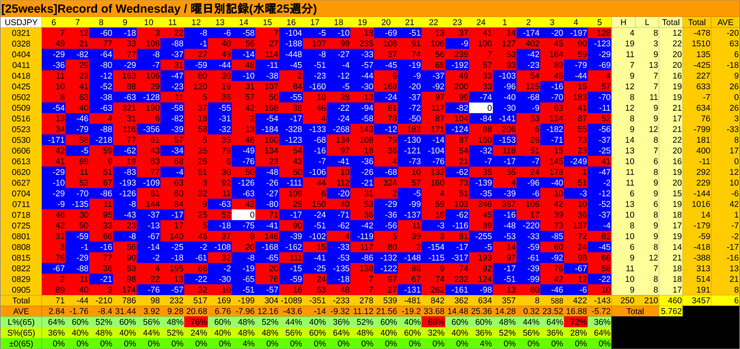 25日間と54日間の2つの期間の表を作成していますが、これは54日間→25日間という流れで見ると良いかもしれません。広い期間から狭い期間を見ることで流れの変化が見えてくるかもしれませんね。